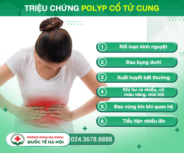 Polyp là những khối u nhỏ nằm trong tử cung, cổ tử cung, ống tử cung. Polyp lành tính, ít gây nguy hiểm nhưng nếu số lượng nhiều, kích thước u lớn sẽ gây xuất huyết tử cung, dẫn đến thiếu máu mạn tính. Polyp làm tăng lượng dịch tiết, thay đổi môi trường âm đạo và tạo điều kiện cho vi khuẩn gây bệnh phát triển và gây viêm nhiễm âm đạo, viêm âm hộ và viêm cổ tử cung.