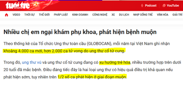 Theo Báo cáo của Tổ chức Y tế Thế giới (WHO, 2022), ung thư cổ tử cung là loại ung thư phổ biến thứ 4 ở phụ nữ trên toàn thế giới, trong đó hơn 85% ca mắc được phát hiện ở giai đoạn muộn do chị em chủ quan không đi khám phụ khoa định kỳ. Khi bệnh được chẩn đoán ở giai đoạn sớm, tỷ lệ sống sau 5 năm có thể đạt tới 92%; nhưng nếu phát hiện muộn, con số này giảm xuống chỉ còn khoảng 17%.