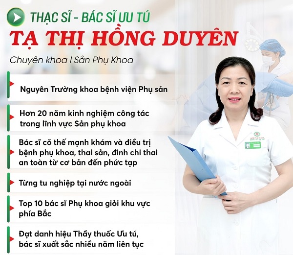 Bác sĩ Tạ Thị Hồng Duyên: Bác sĩ có hơn 20 năm kinh nghiệm khám chữa bệnh phụ khoa, từng công tác tại các bệnh viện phụ sản tại Hà Nội. Bác sĩ được phong tặng danh hiệu Thầy thuốc Ưu tú, Lao động tiên tiến nhiều năm liền.