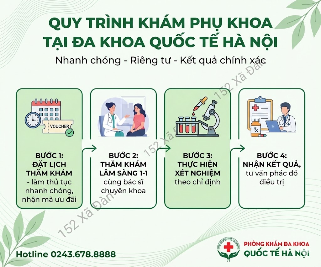 Quy trình khám phụ khoa tại Đa khoa Quốc tế Hà Nội được thiết kế theo mô hình khép kín – tôn trọng người bệnh giúp chị em yên tâm khi thăm khám. Các bước thực hiện theo đúng chỉ định chuyên môn như sau: