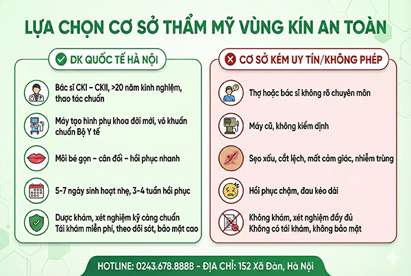 Hiện nay, có nhiều cơ sở có dịch vụ thẩm mỹ vùng kín, tân trang “cô bé”. Tuy nhiên, không phải địa chỉ nào cũng uy tín. Việc chủ quan trong lựa chọn địa chỉ thẩm mỹ vùng kín, thực hiện cắt môi bé tại cơ sở y tế kém uy tín, không được cấp phép, giá rẻ hay đảm bảo điều kiện y tế có thể dẫn tới nhiều hệ lụy khó lường: