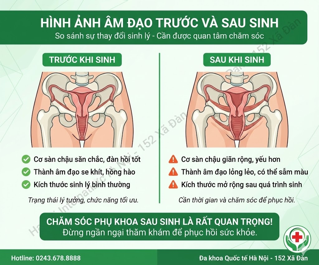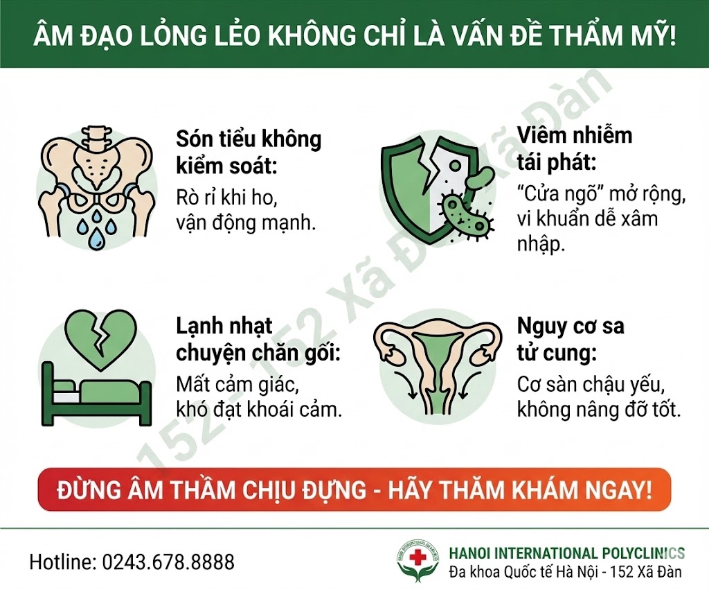 - Lá chắn bảo vệ bị phá vỡ: Khi âm đạo giãn rộng, miệng âm đạo luôn ở trạng thái “mở”, tạo đường cho vi khuẩn từ bên ngoài xâm nhập. Đây là nguyên nhân hàng đầu gây viêm nhiễm phụ khoa mãn tính, khí hư bất thường và mùi hôi khó chịu.