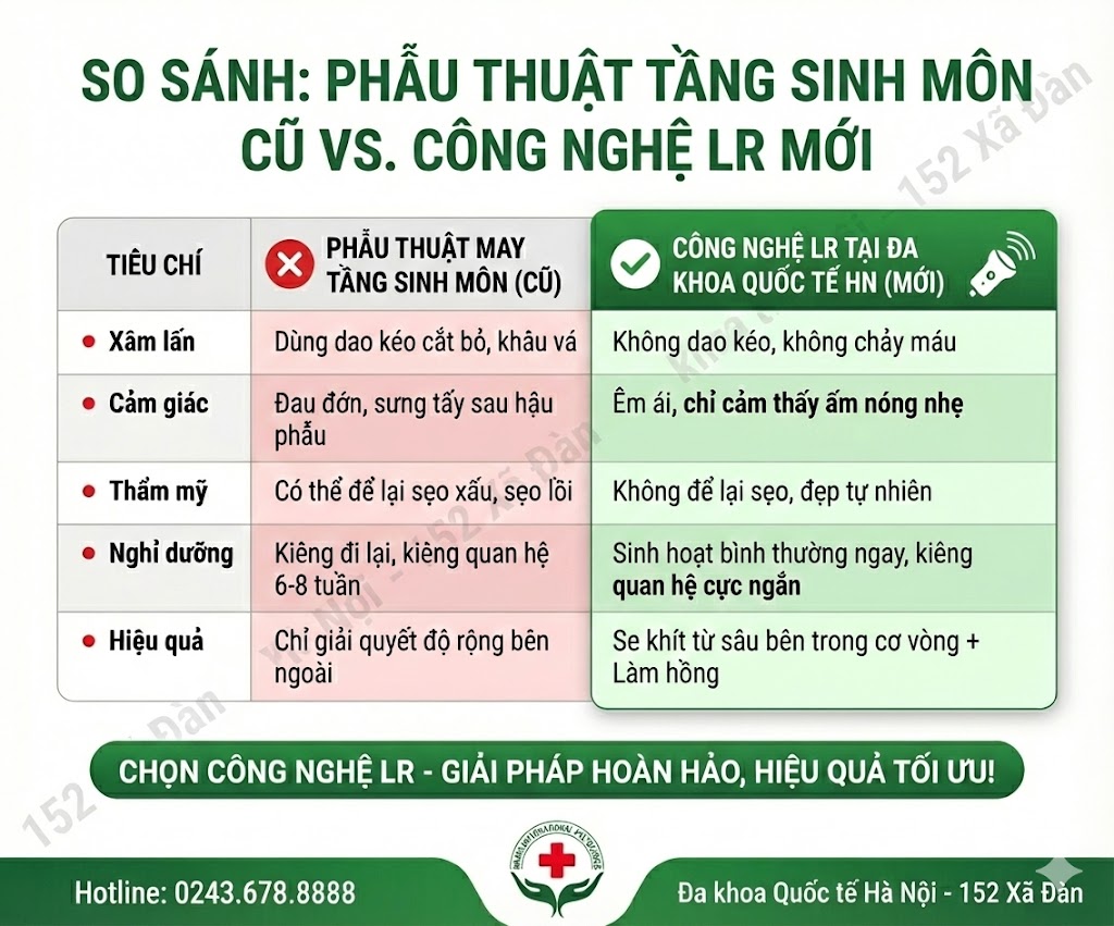 Nếu trước đây, để thu hẹp vùng kín, chị em buộc phải chấp nhận phẫu thuật cắt bỏ da thừa và khâu tầng sinh môn đầy đau đớn, để lại sẹo xấu và mất hàng tháng trời kiêng cữ; thì nay, Công nghệ LR ra đời như một cuộc cách mạng thay đổi hoàn toàn định kiến đó.