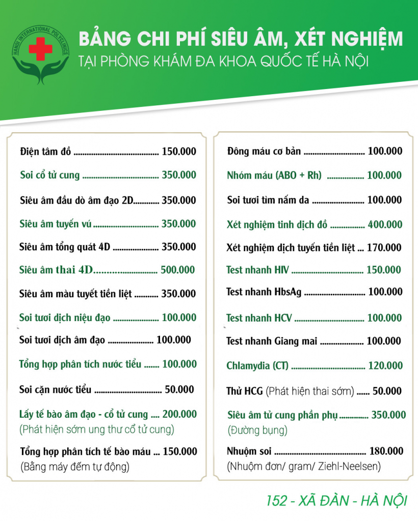 Mỗi hạng mục xét nghiệm sẽ có mức phí khác nhau nhưng không có nhiều khác biệt giữa các phòng khám và bệnh viện. Người bệnh thăm khám hạng mục nào thì chi trả hạng mục đó. Tại phòng khám phụ khoa Đa Khoa Quốc Tế Hà Nội 152 Xã Đàn chi phí xét nghiệm sẽ dao động từ 100.000đ – 350.000đ.