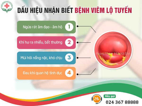 Khí hư vàng xuất hiện ở thời điểm đầu giai đoạn 1 của việm lộ tuyến. Giai đoạn 2 và 3 sẽ chuyển sang màu xanh đậm có mủ, tấn công sâu vào tử cung. Viêm lộ tuyến thường đi kèm triệu chứng