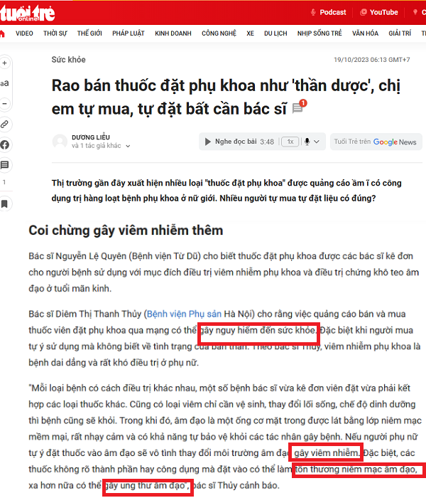 Với tâm lý e ngại cộng thêm những lời quảng cáo có cánh từ những người bán hàng Online như “dùng một lần đánh bay mùi cô bé“, hình ảnh “cặn bẩn” được cho là tích tụ trong âm đạo được đào thải sau khi đặt thuốc. Nhiều chị em đã tự mua thuốc đặt về chữa các vấn đề tại vùng kín trong khi chưa biết nguồn gốc gây ra. Chính hành động thiếu hiểu biết này khiến chị em nhận lại những “trái đắng“, gây “phản ứng ngược“.