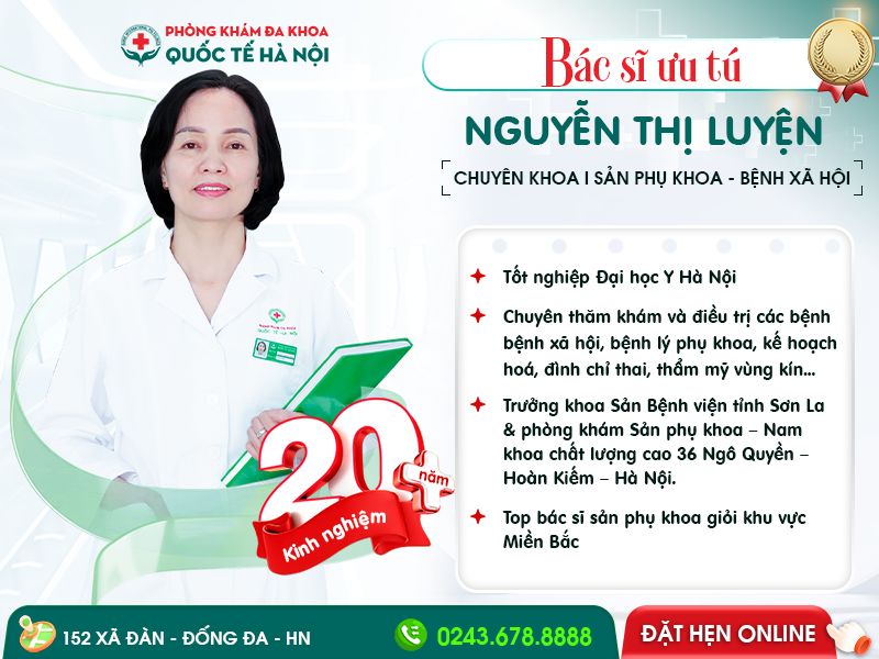 Bác sĩ Ưu tú Nguyễn Thị Luyện – Chuyên khoa Phụ khoa, với hơn 20 năm kinh nghiệm trong khám và điều trị các bệnh lý phụ khoa. Bác sĩ nổi tiếng nhờ sự tận tâm, chính xác trong chẩn đoán và áp dụng các phương pháp điều trị tiên tiến, giúp hàng ngàn chị em lấy lại sức khỏe sinh sản và tự tin trong cuộc sống.